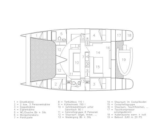 Im Backbordrumpf leben unsere Gäste. In diesem befindet sich in der Mitte eine Dreierkabine sowie im Achterbereich eine Doppelkabine. Dazwischen liegt unabhängig eine Nasszelle mit Dusche und WC.Im Steuerbordrumpf leben Skipper und Hostess. Die ideale Gästebelegung beträgt 4 Personen. Für enge Freunde oder Familienmitglieder kann die vordere Backbordkabine jedoch auch mit 3 Gästen belegt werden. Der Salon […]