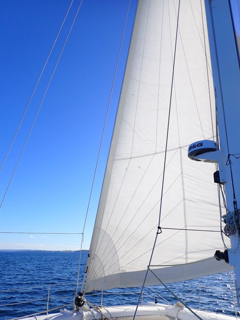 Da wir am Samstag um 10 Uhr einen Termin bei den Behörden zum Ausklarieren hatten, konnten wir kurz vor zwölf Uhr den Anker lichten. Am Anfang hatten wir nicht so viel Wind wie von den Meteorolügen versprochen, und wir sind nicht ganz so flott vorangekommen, wie wir gehofft hatten. Aber um die Seebeine wachsen zu lassen, war es gerade richtig.